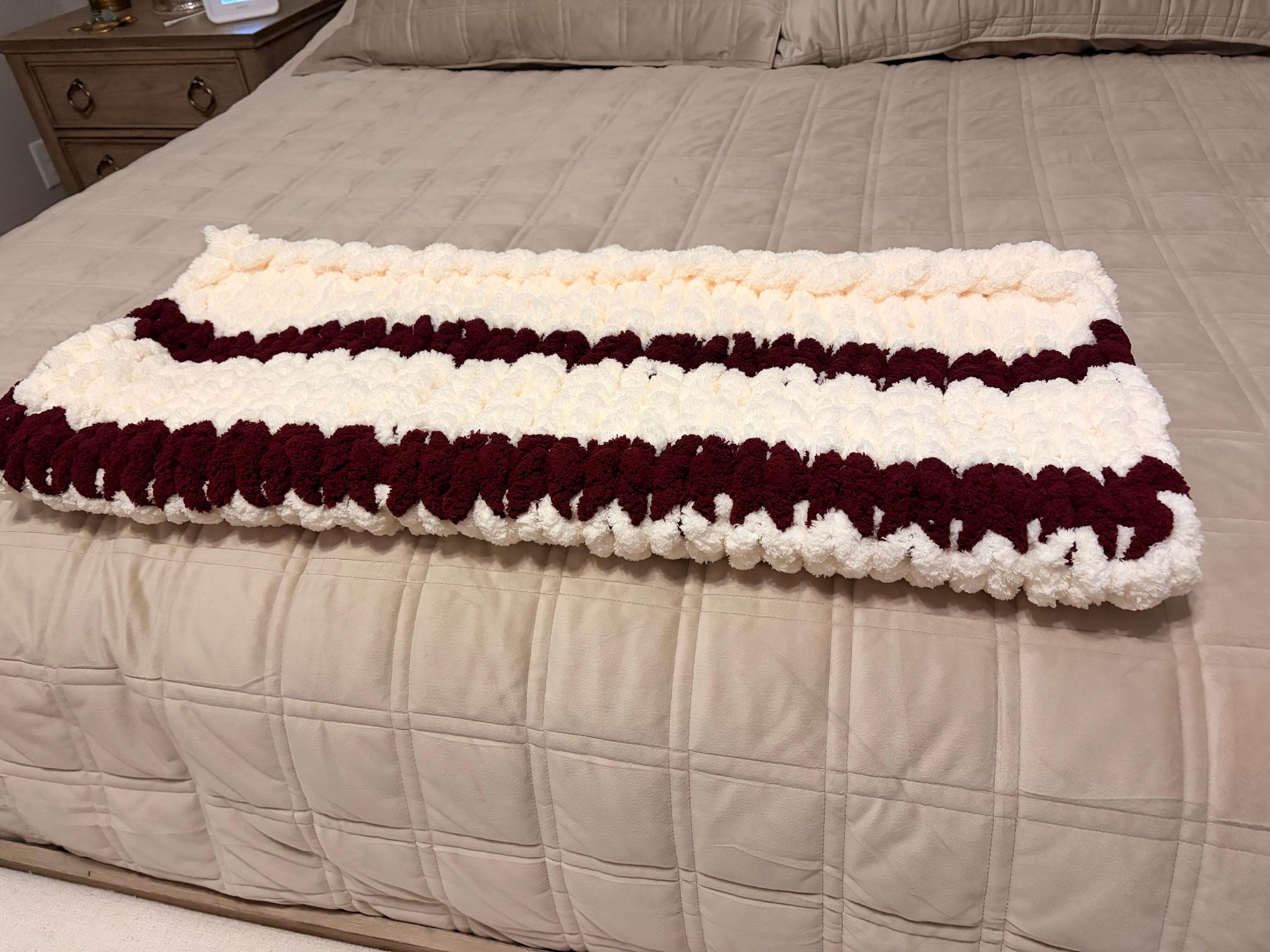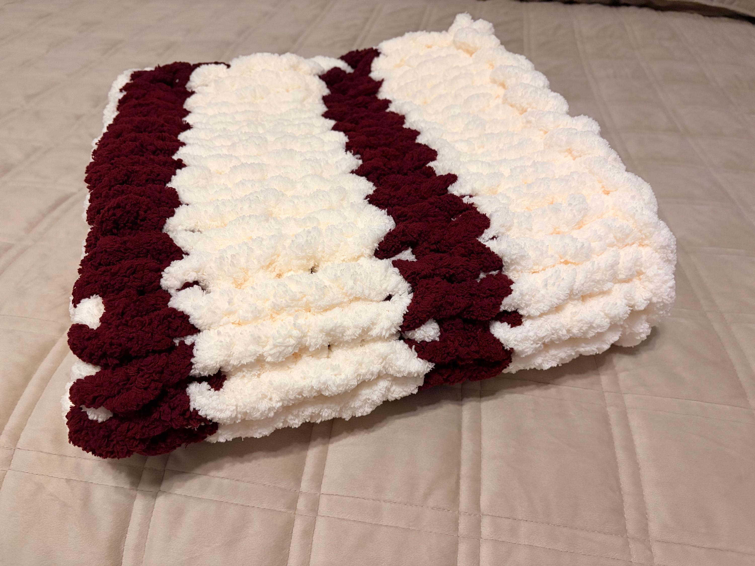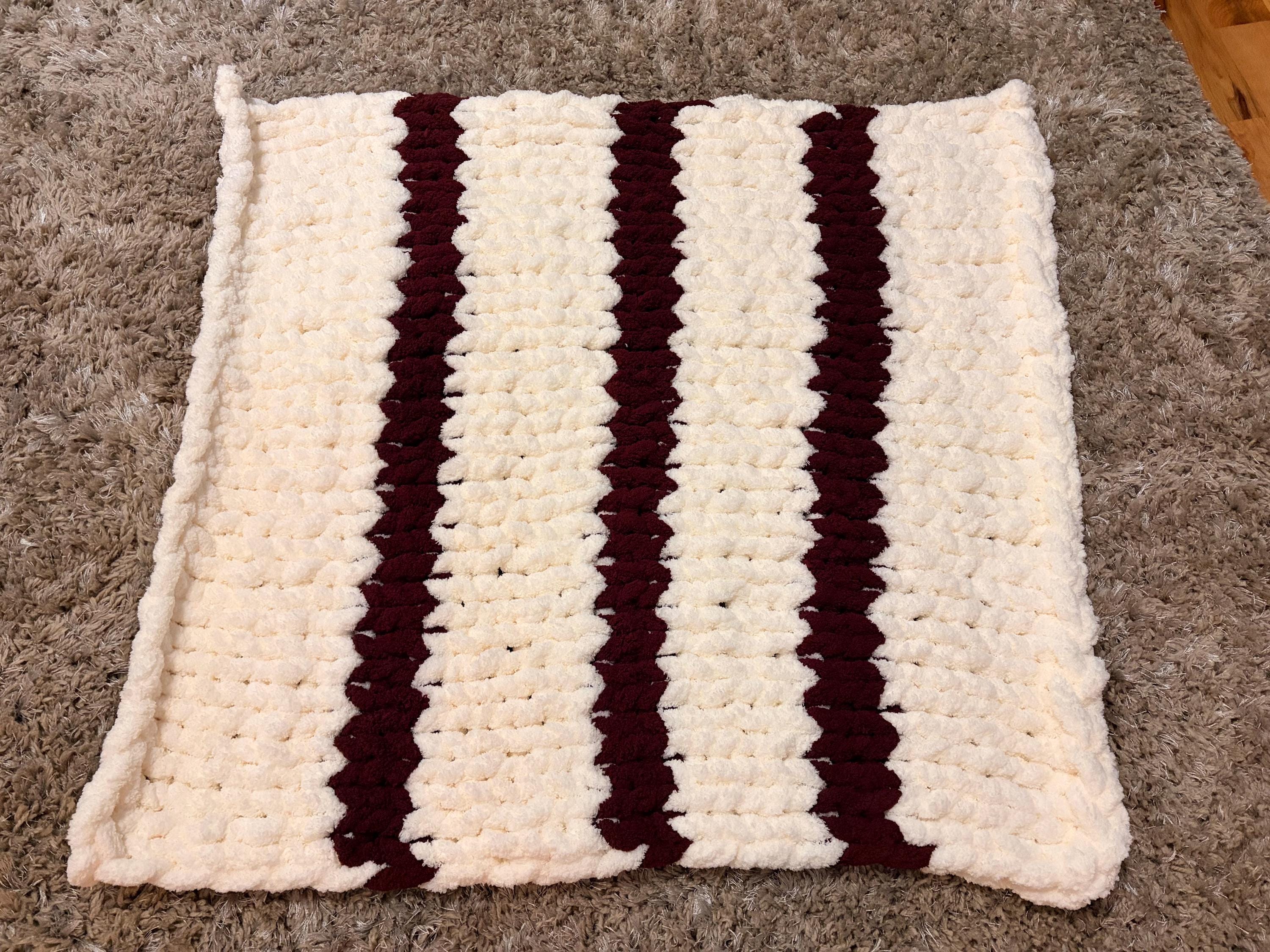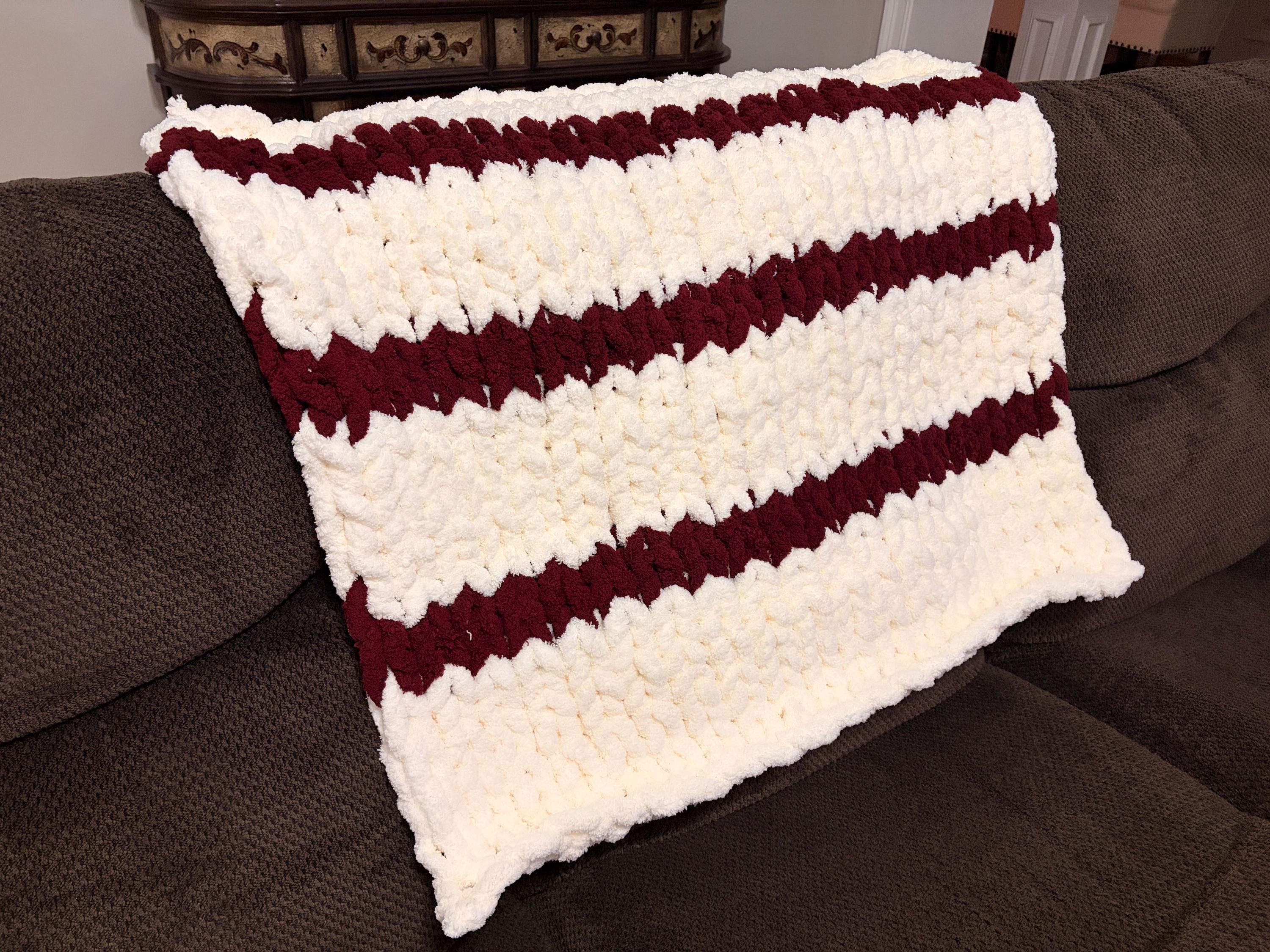 Chunky Knit Baby Blanket, Cream & Wine Chenille Yarn, Nursery Throw