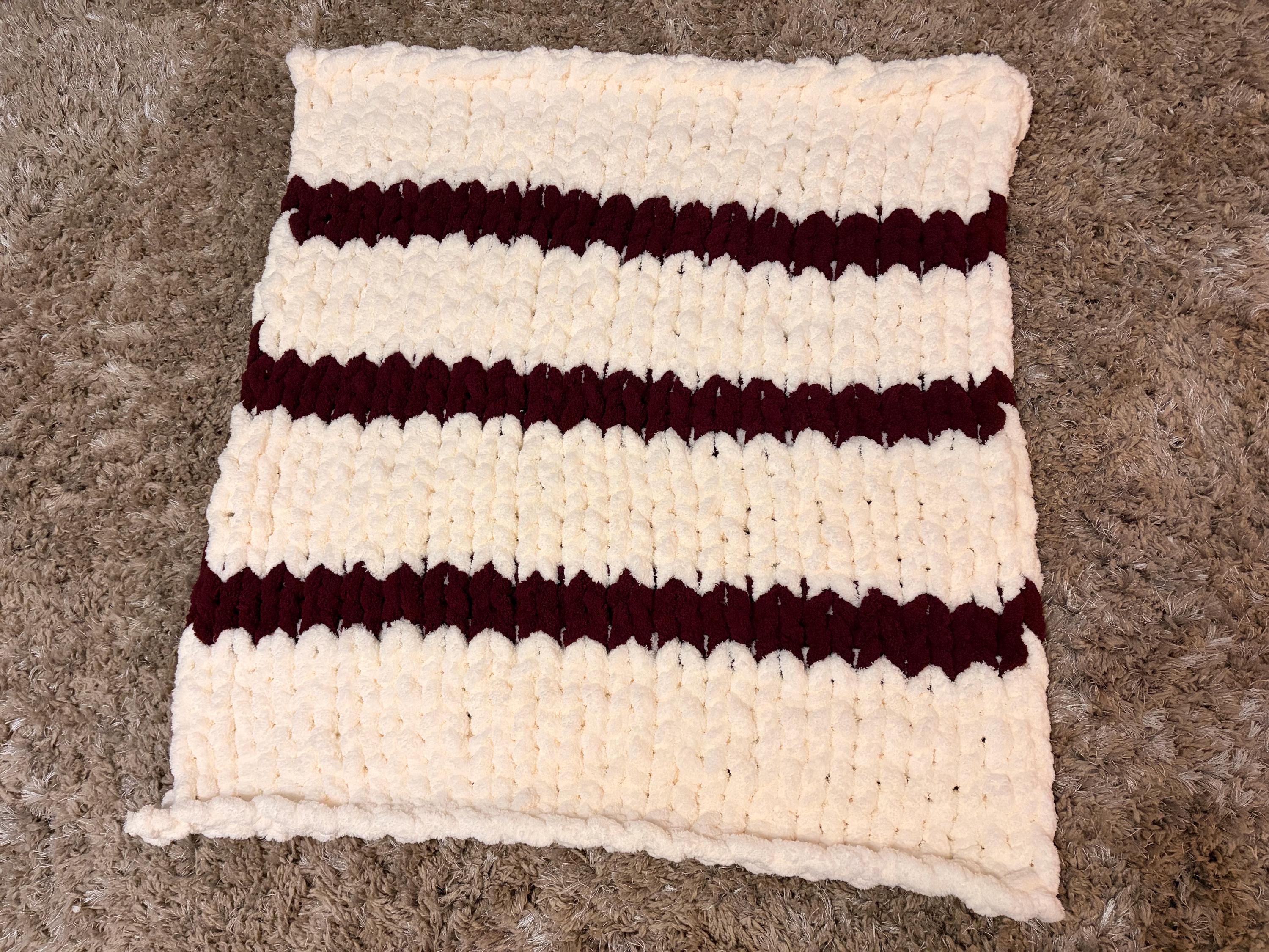 Light cream and burgundy baby blanket, plush, perfect for first photos! Works great as a lap blanket and pet blanket too!