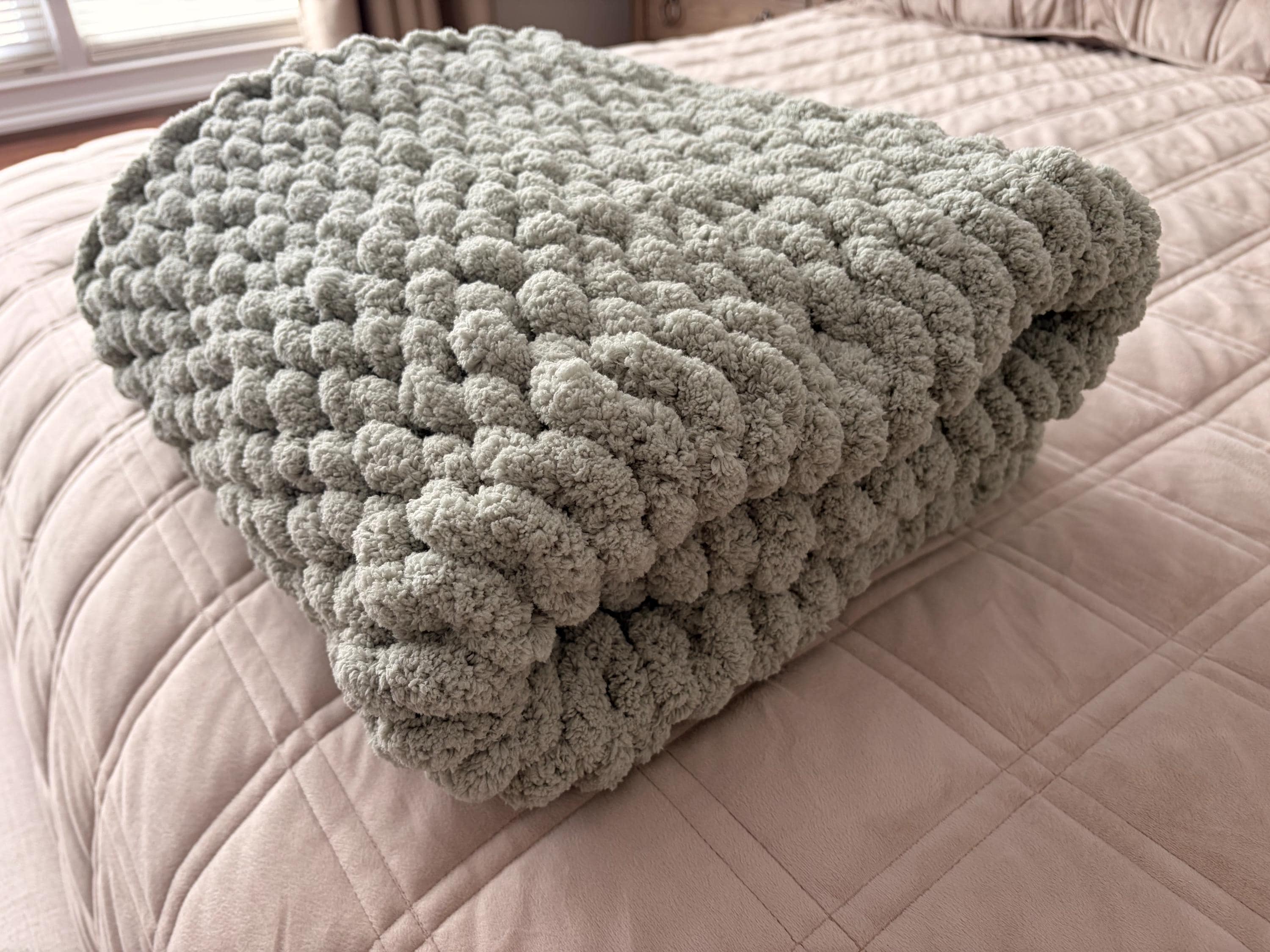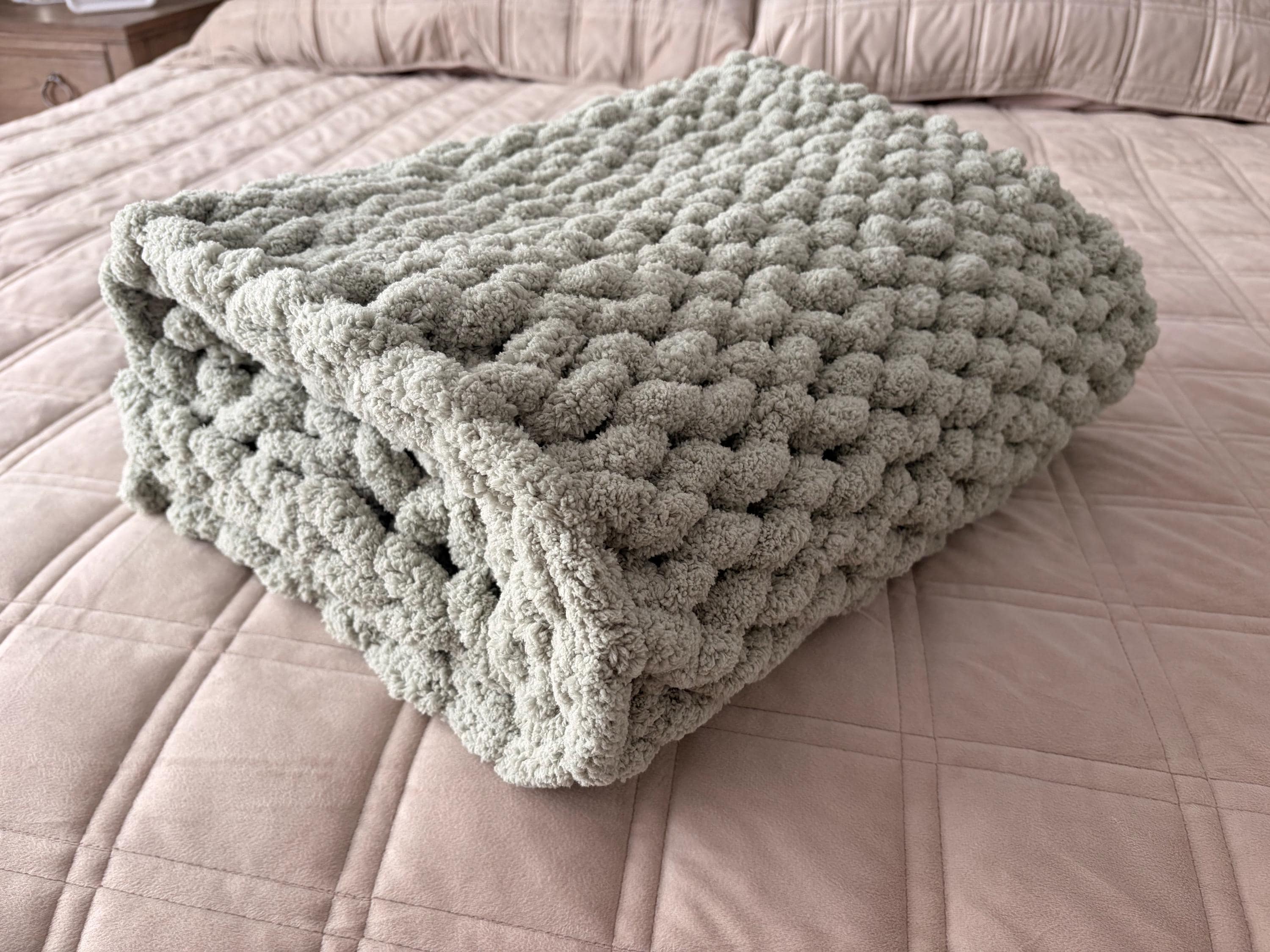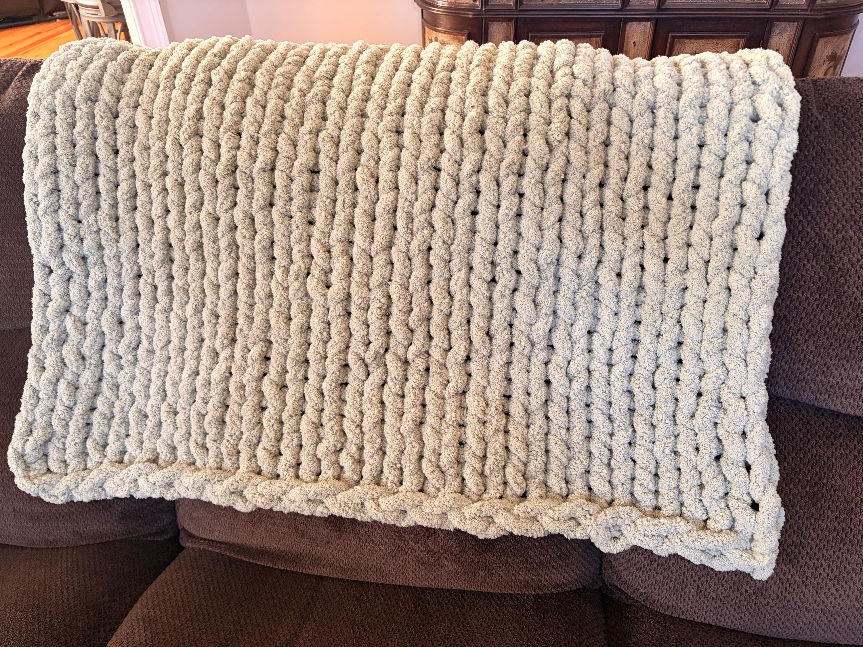 Handmade Sage Green Chunky Knit Baby Blanket, Chenille Yarn, Nursery Throw