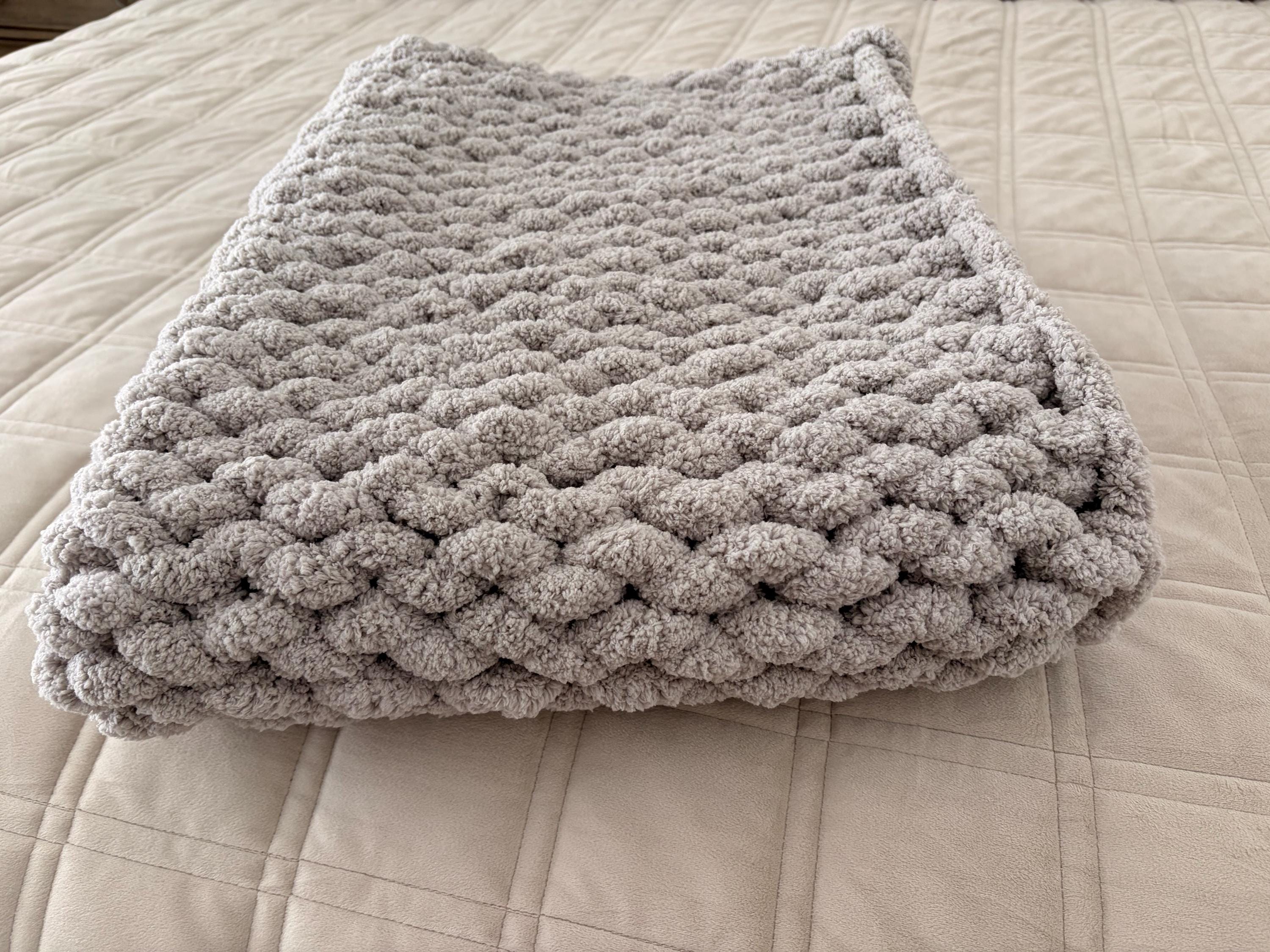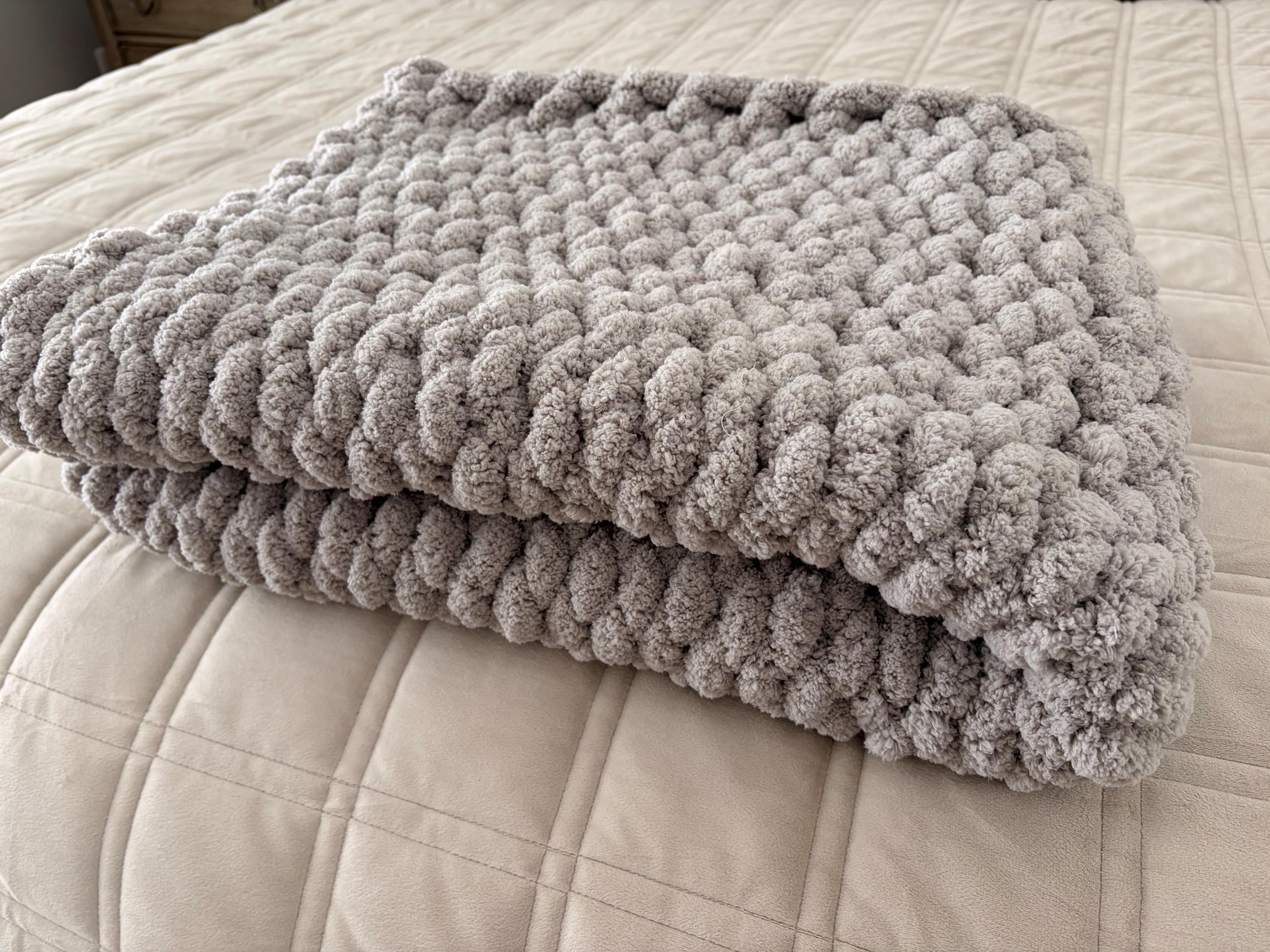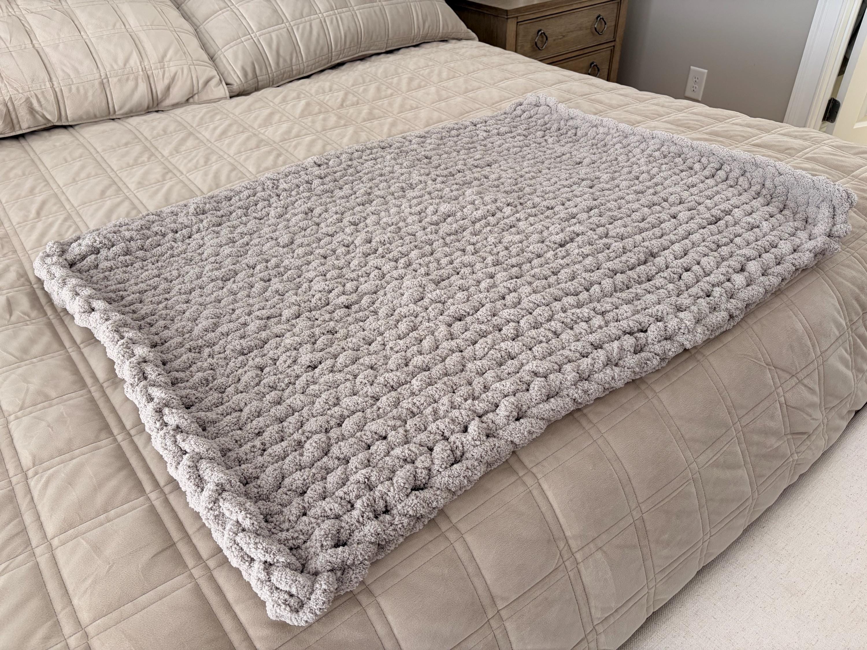 Handmade Chunky Knit Gray Baby Blanket, Chenille Yarn, Nursery Throw