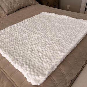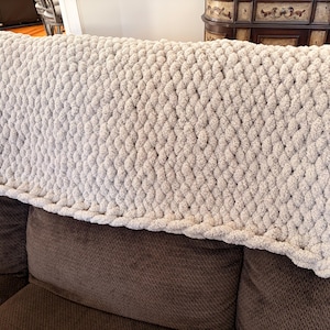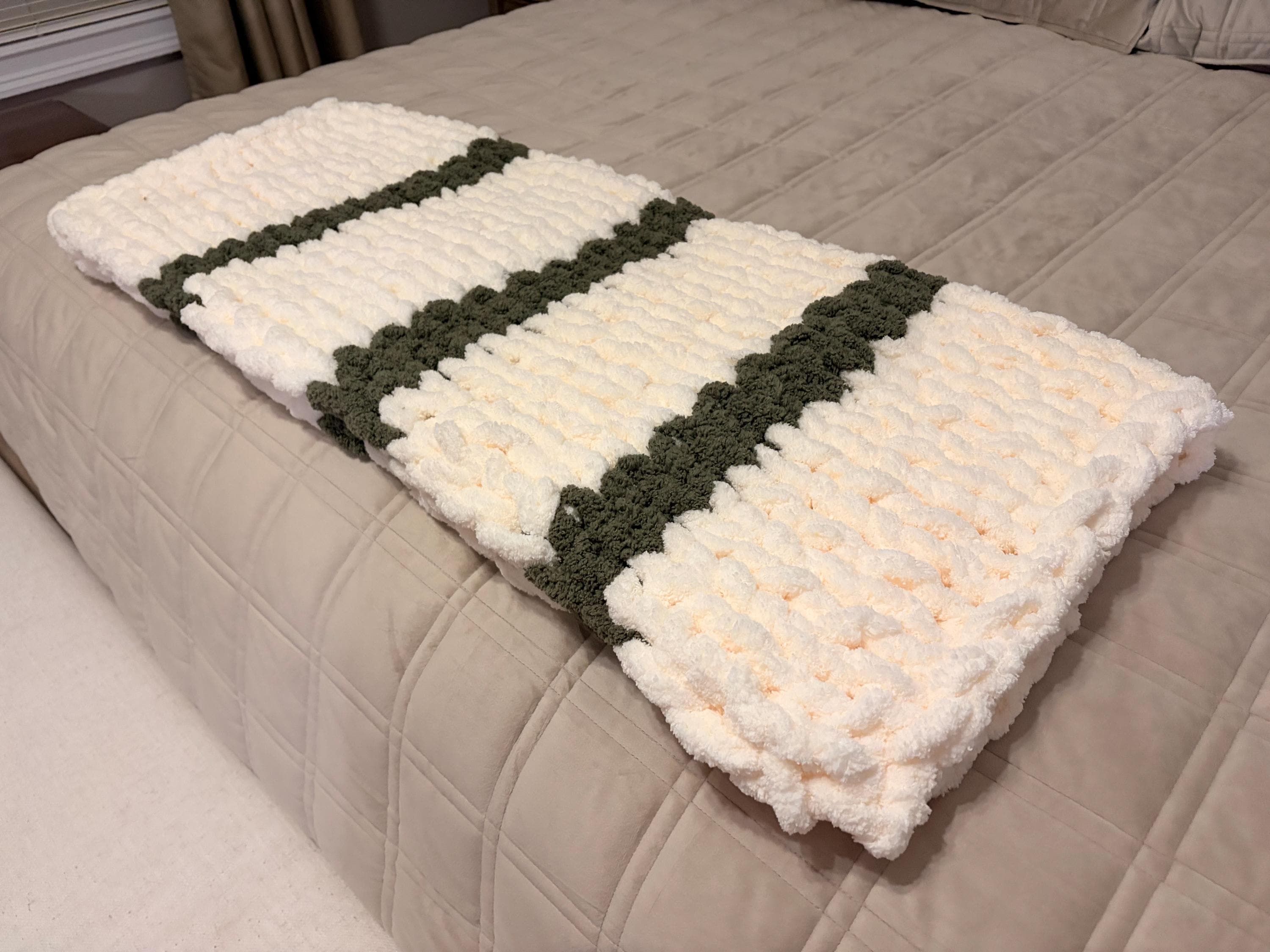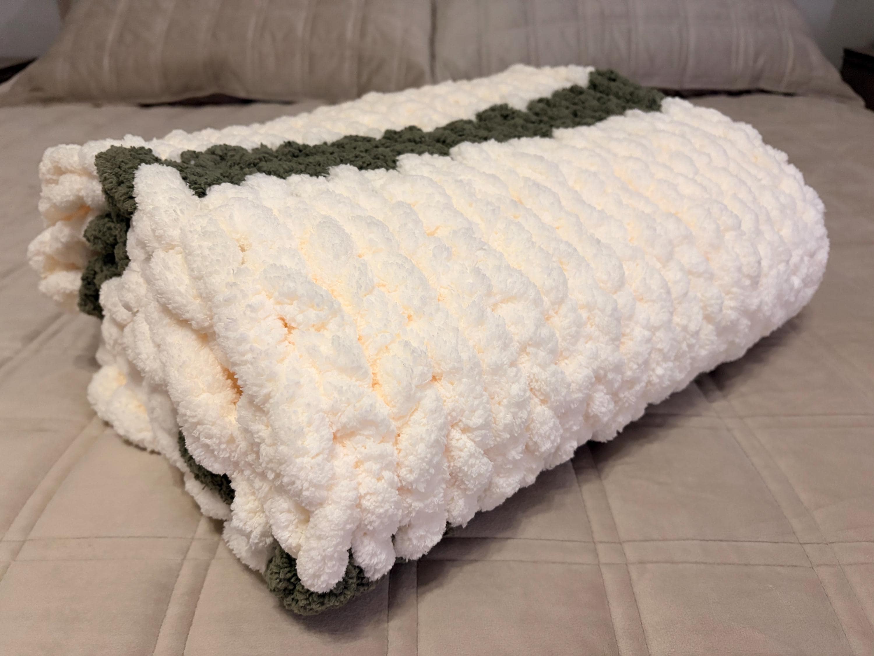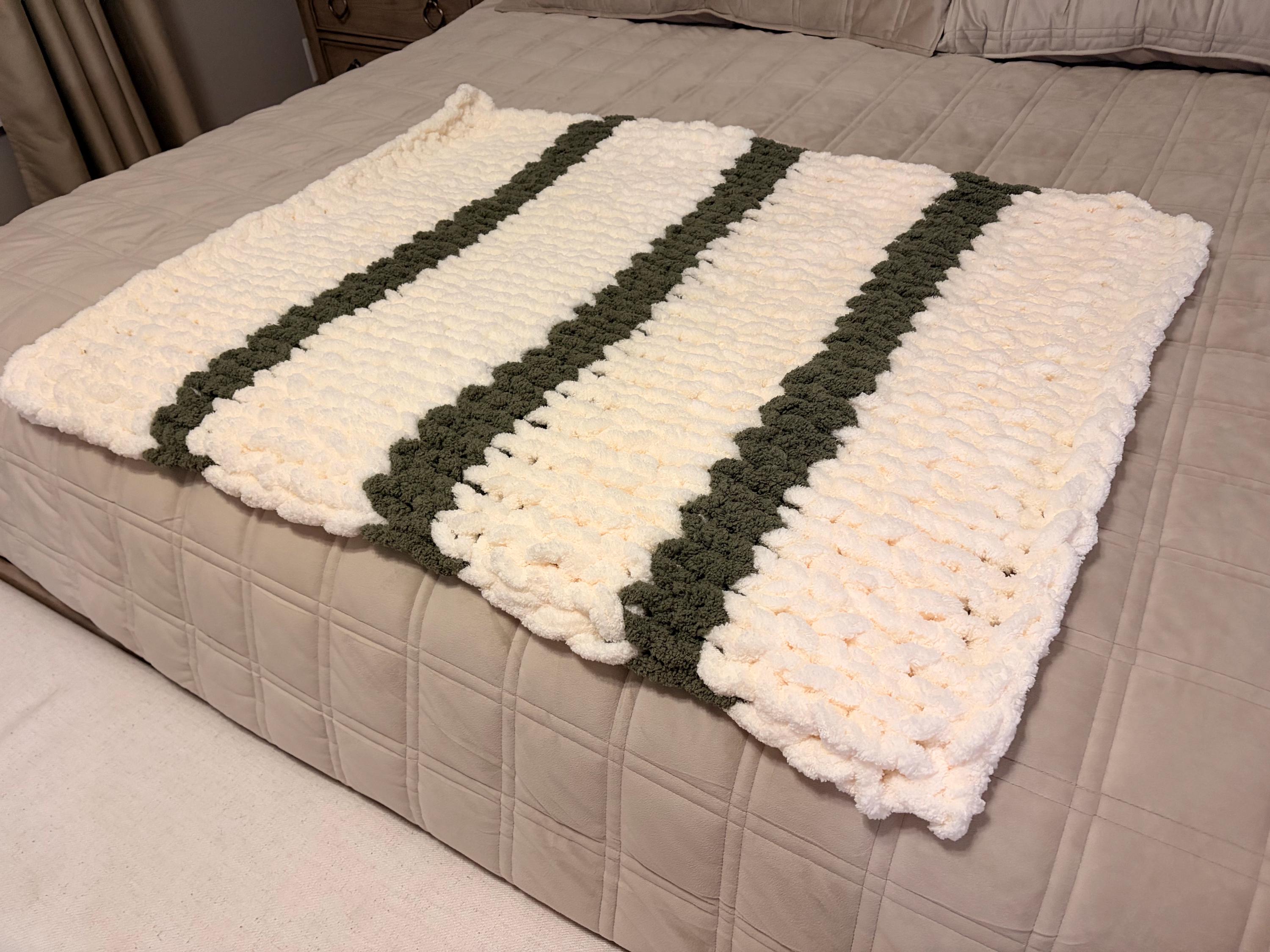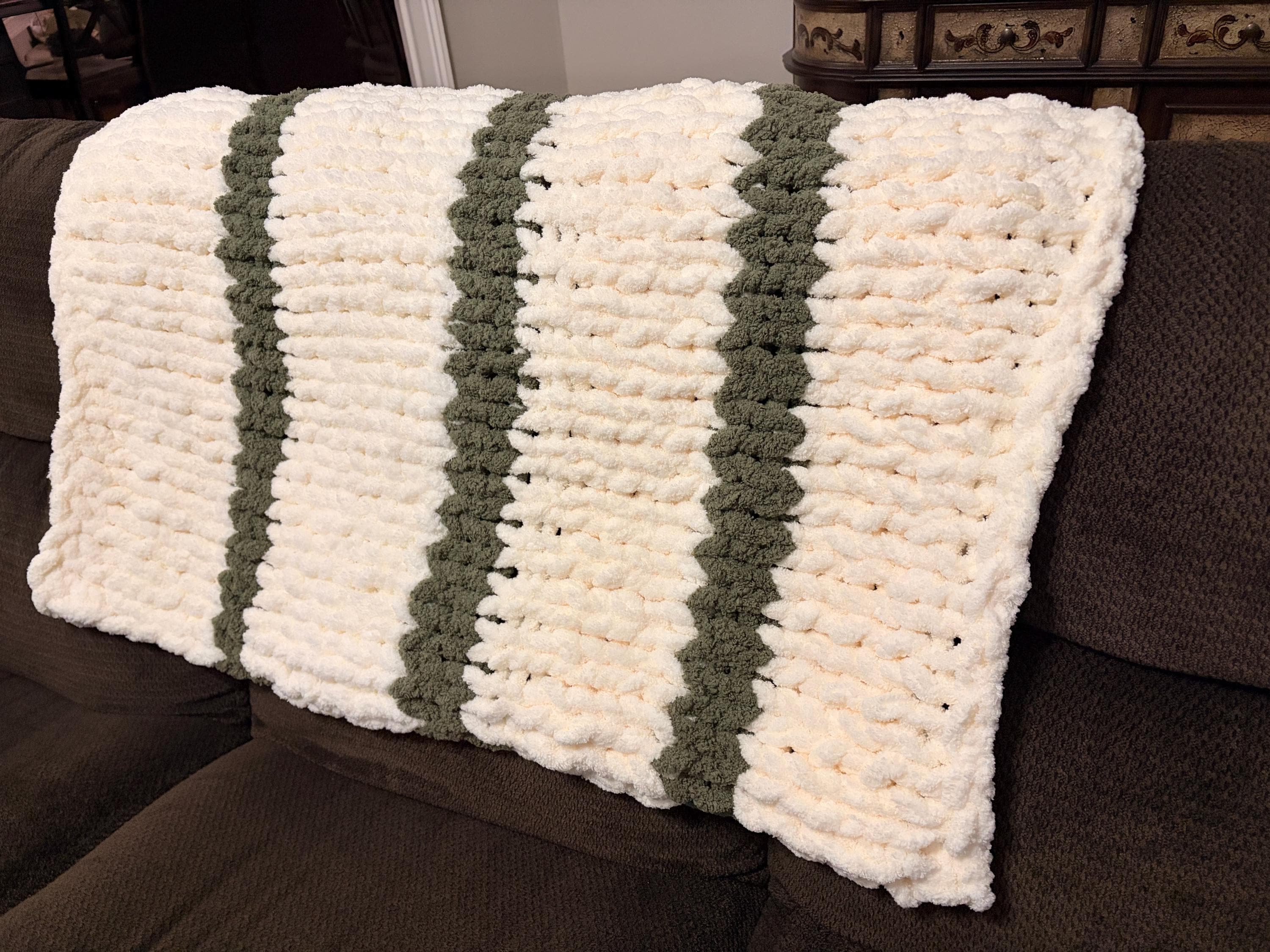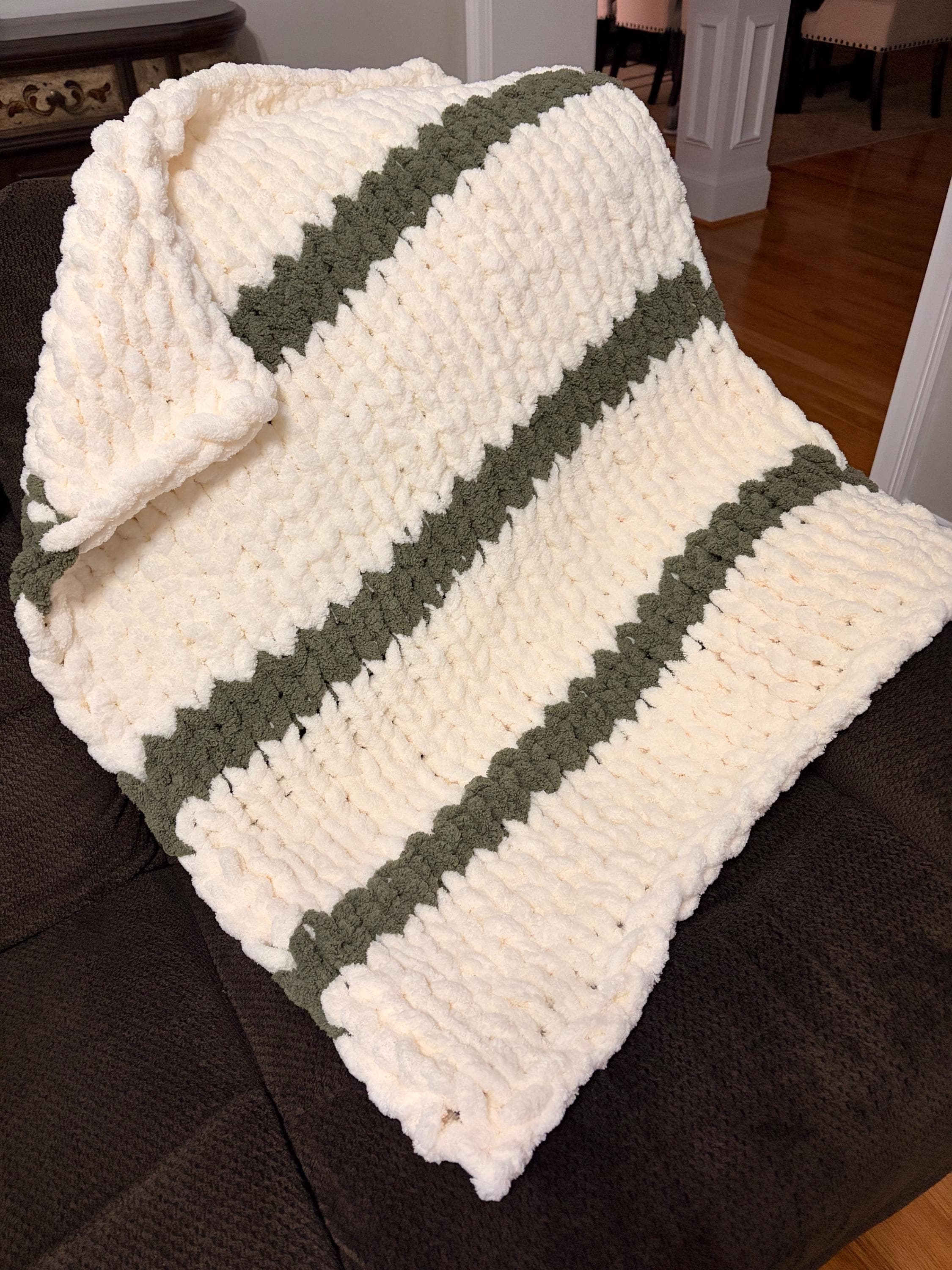 Chunky Knit Baby Blanket, Cream & Green Chenille Yarn, Nursery Throw